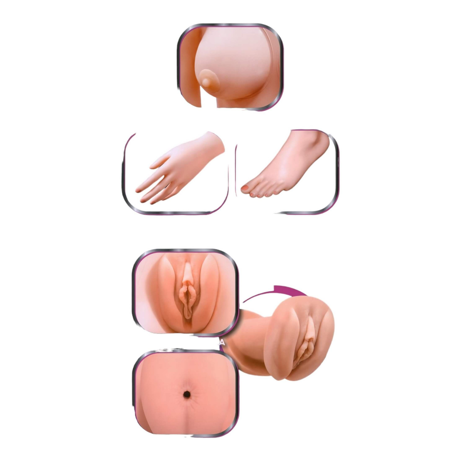 • Elastīga, zīdaini mīksta, izņemama vagina un anālais atvērums ar rievotu tekstūru