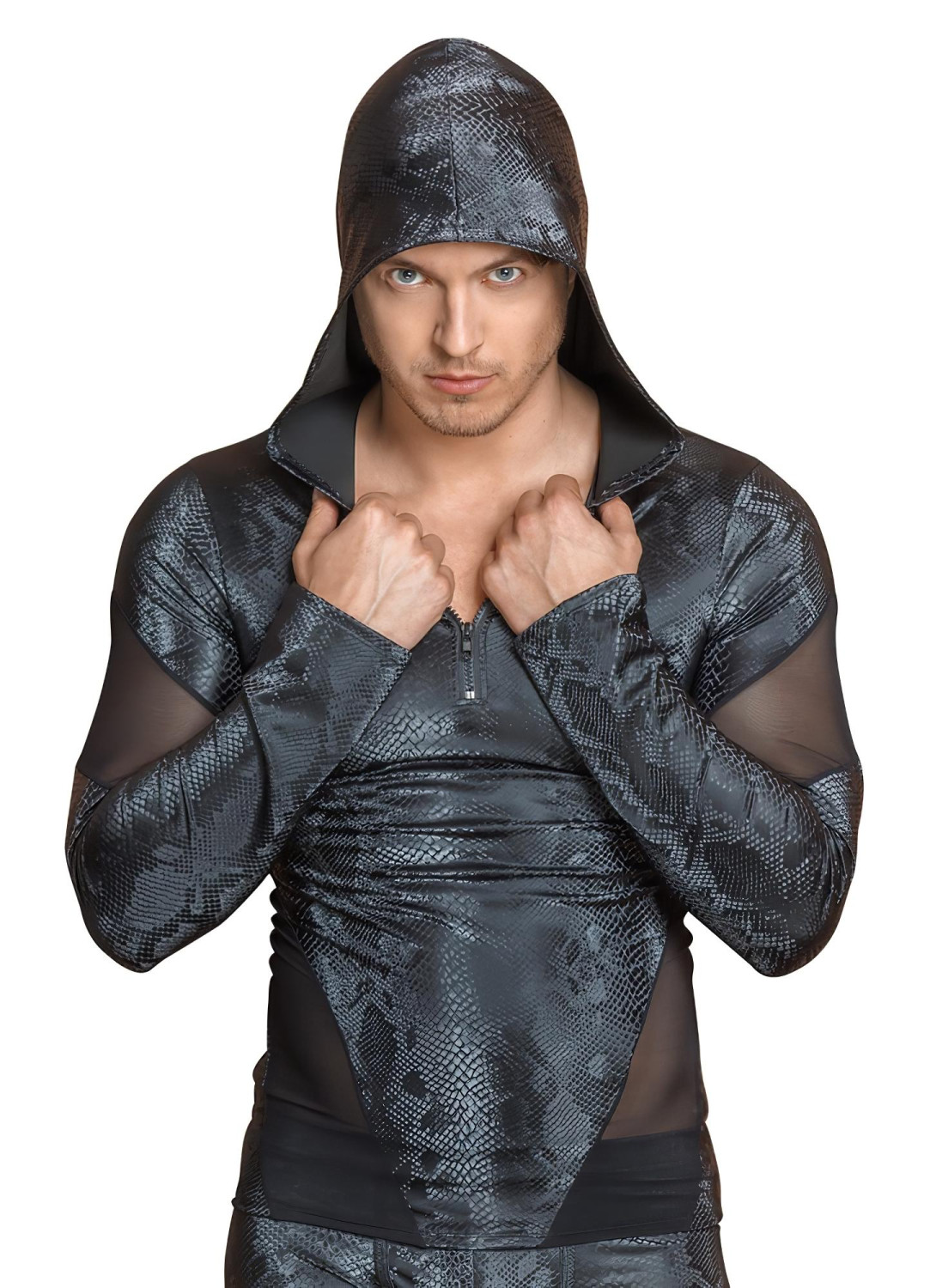 Īpaši seksīgs kapučjakas stila tops ar čūskādas rakstu - caurspīdīgi tīkliņa ielaidumi uz vēl iekārojamāku izskatu!